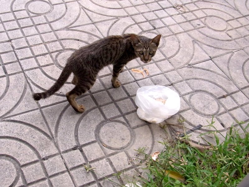 清潔人員正在餵牠吃鱈魚香絲呢,看來曼谷的貓比台北的貓幸福多了。