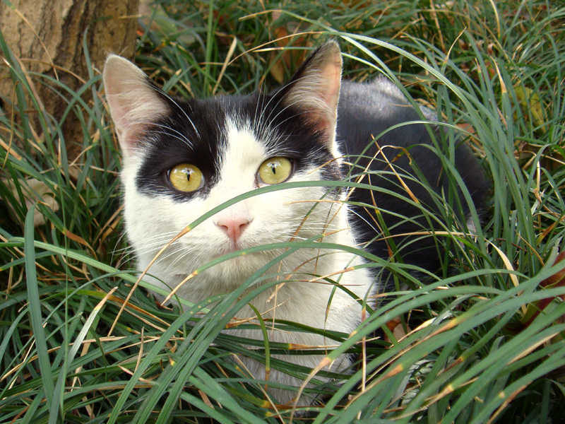 粉紅色領圈? 我想這是位妹吧。 雖然看來像位哥,不過這裡實在因為貓種不同,個個虎背熊腰的大頭貓其實都是女生。 另一隻鬼祟躲在草裡的乳牛貓,一時分不出性別。 遠方又來晃過一隻… 此時草裡的這隻還是不動,以為牠不動我就看不到牠嗎? 啊眼對眼了… 沒想到對上眼後牠就不怕生反倒出來見客了,應該是隻警戒心較低的小公貓吧。