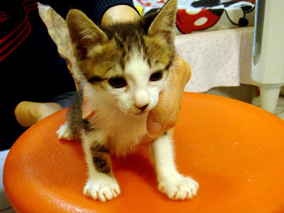 幾天前社區的愛心媽媽在社區後方的馬路旁發現了一個小紙箱,紙箱裡裝了一隻小小的小貓。根據她的經驗,她覺得這隻小小貓應該是被遺棄的,有人在路上看到了小貓,覺得非常可愛忍不住帶回家,回家養了幾天才發現養貓並不如預期,於是就把小小貓放在紙箱裡再丟到有愛心媽媽出入的地方。如果真是這樣,那也實在惡劣,這麼小的貓,也許還有母貓隨伺在側,就這樣把人家帶離母親,然後又隨意丟棄,簡直匪夷所思,實為天地不容。